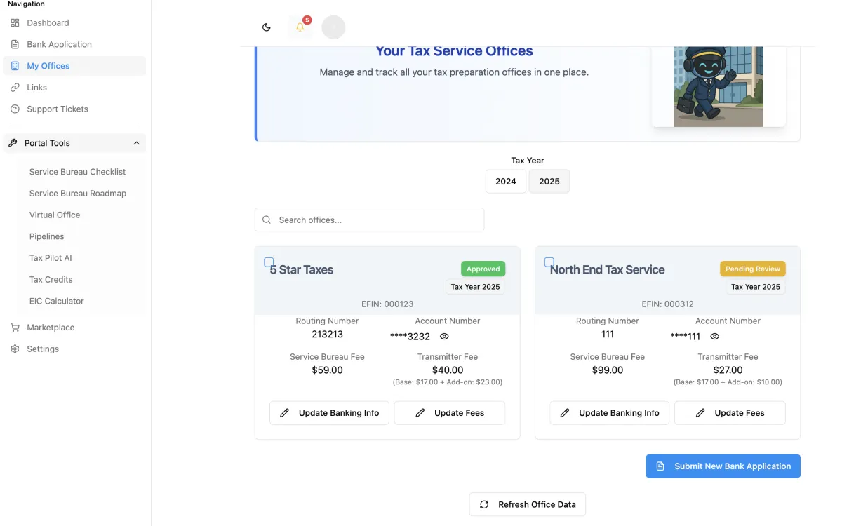 With Tax Pilot, you can easily submit and manage all bank applications directly from your portal. Offer your offices refund advances, prepaid debit cards, and check printing services to their clients.