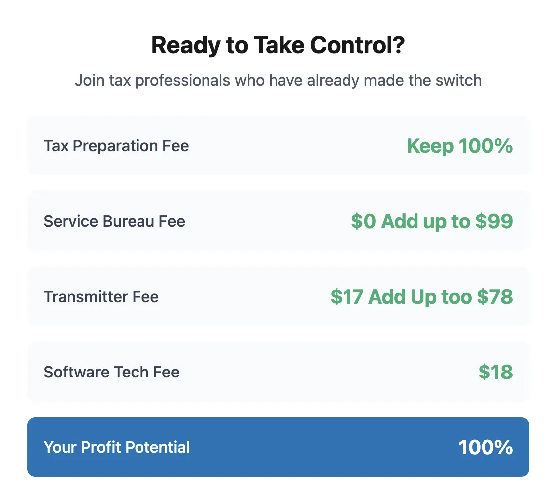 Join our comprehensive service bureau program and get the training, tools, and support you need to build a successful career building teams and selling Tax Software. The 2025 tax season is coming - start your journey today!
